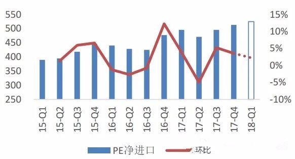 數(shù)據(jù)顯示,中國聚乙烯進(jìn)口依存度在40-45%左右,進(jìn)口依賴度較高。2018年1月份聚乙烯進(jìn)口128.9萬噸,環(huán)比增加17%。2月份由于春節(jié)假期因素進(jìn)口量下降明顯,但3月份從遠(yuǎn)洋貨物的到港情況來看,進(jìn)口量仍存較高預(yù)期。