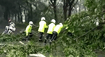為了市民們的行車安全,交警蜀黍們正在努力清除被大風(fēng)吹倒的樹
